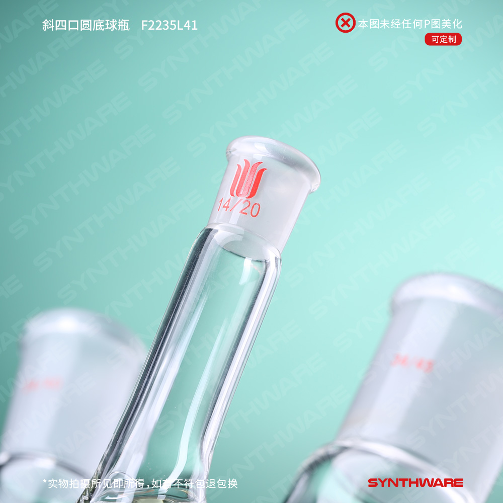 斜四口圆底球瓶,中间磨口:14/20,侧磨口:14/20,100ml F221100