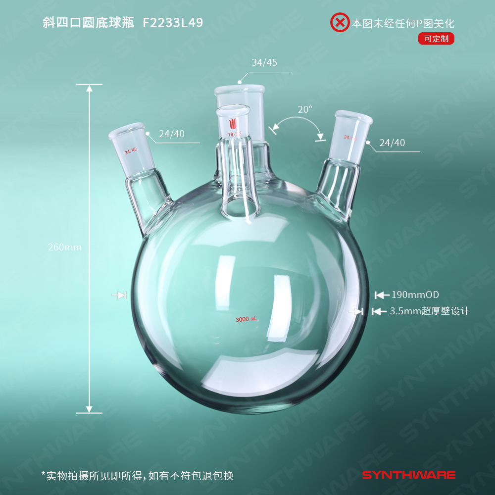 斜四口圆底球瓶,主口:29/42,侧磨口:29/42,前口24/40,3000ml F22293L