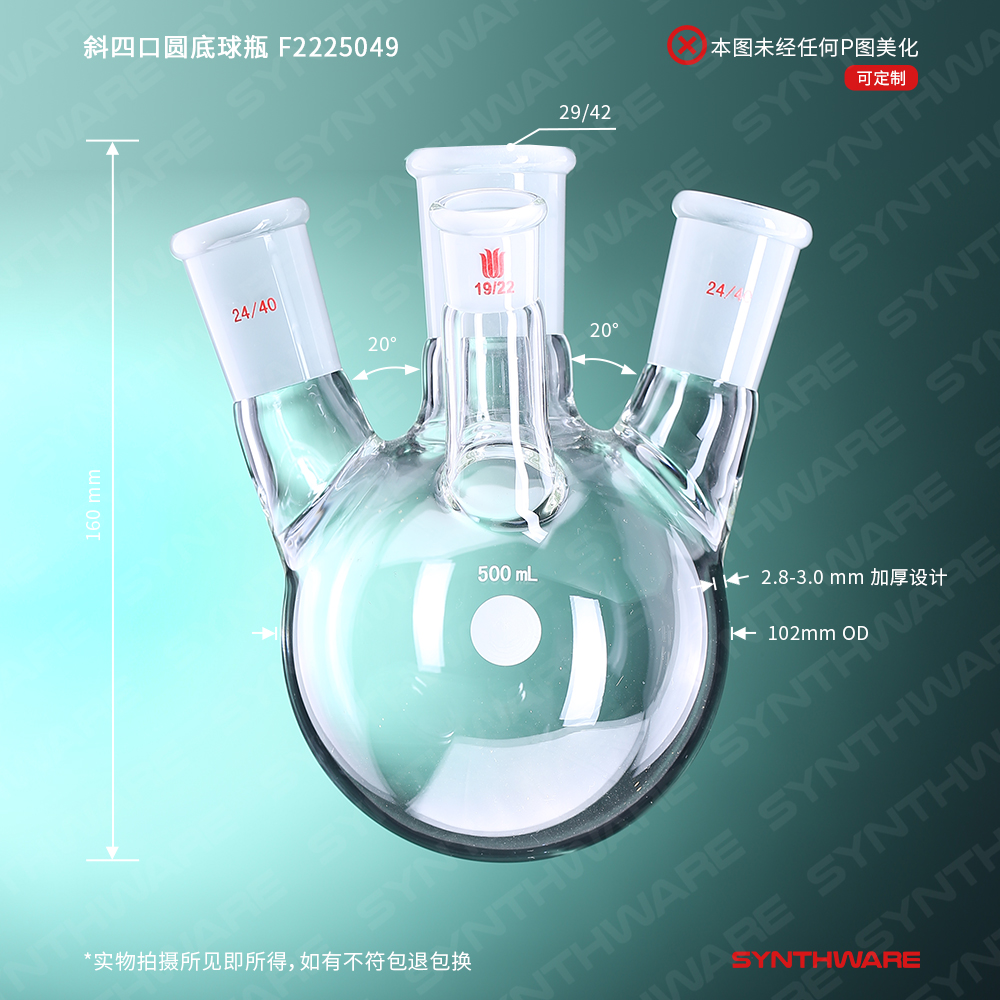 斜四口圆底球瓶,中间磨口:29/42,侧磨口:24/40,500ml F222500