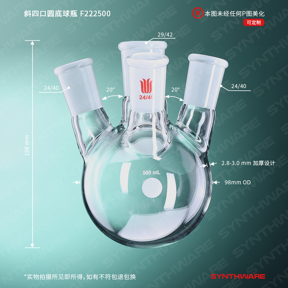 侧口可根据需求连接其他功能性接头或装置如:通气接头,冷凝器,加料漏斗等。不建议连接温度计或温度计套管类产品,如果需要连接温度计类产品请选购F21X小角度四口瓶系列。