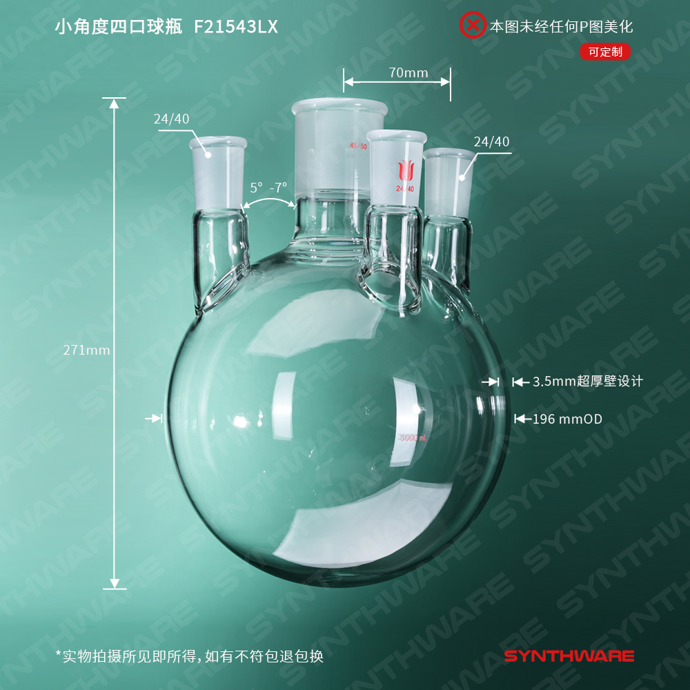 小角度四口圆底球瓶,中间磨口:45/50,侧口和前口:24/40,3000ml F21543LX