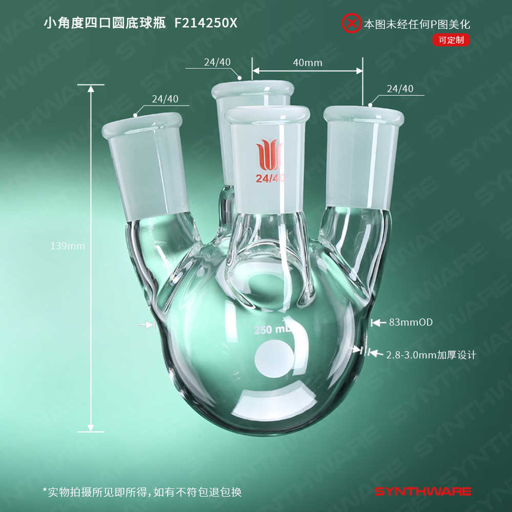 小角度四口圆底球瓶,中间磨口:24/40,侧磨口:24/40,250ml F214250X