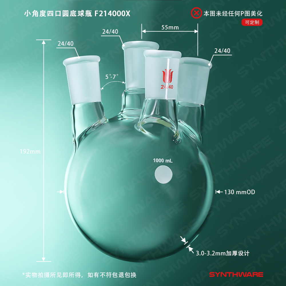 小角度四口圆底球瓶,中间磨口:24/40,侧磨口:24/40,1000ml F214000X