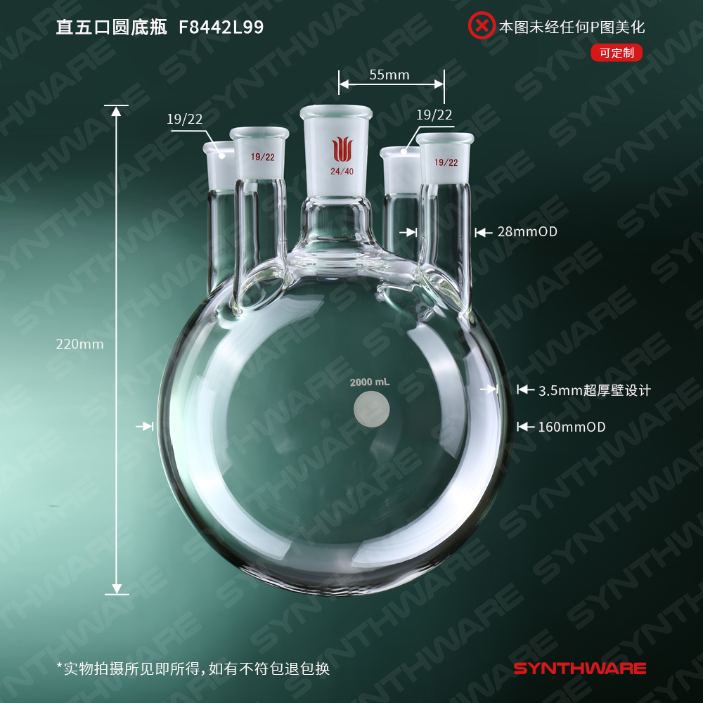 直五口圆底瓶,容量2000ml,主口24/40,边口19/22,边口19/22 F8442L99
