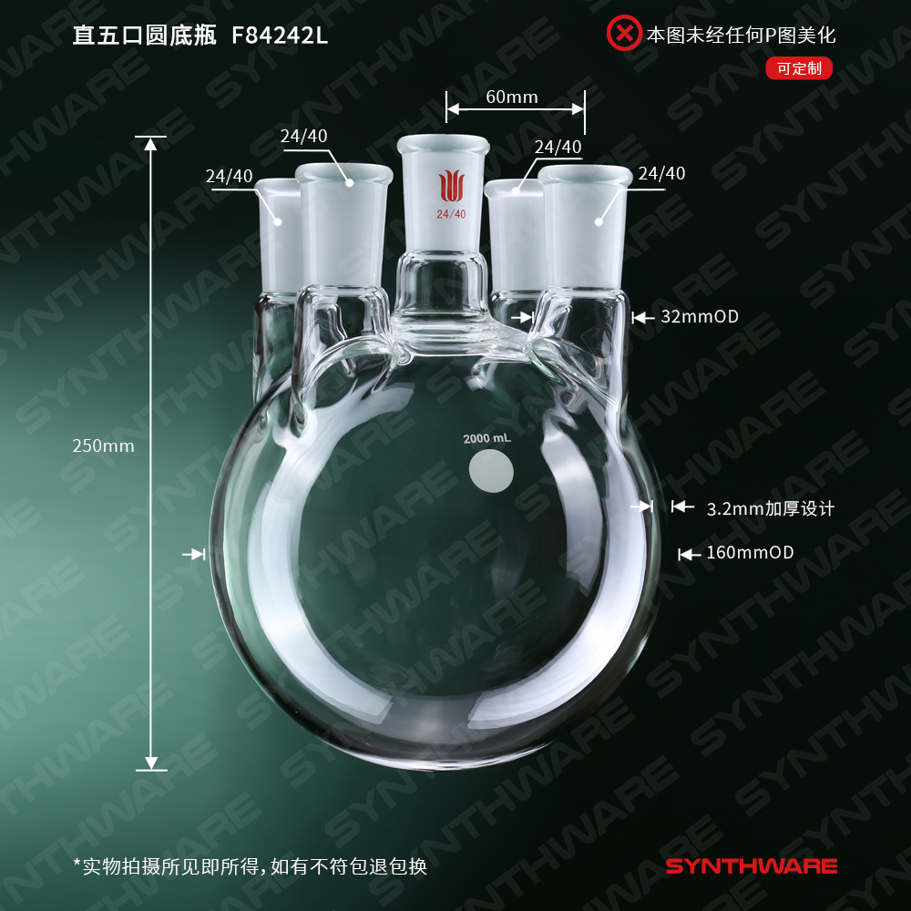 直五口圆底瓶,容量2000ml,主口24/40,边口24/40,边口24/40 F84242L