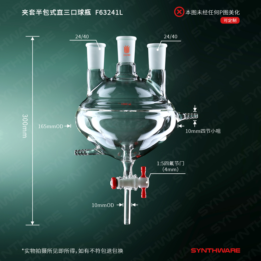 夹套半包式直三口球瓶,主口24/40,侧口24/40,1000ml,4MM四氟节门 F63241L