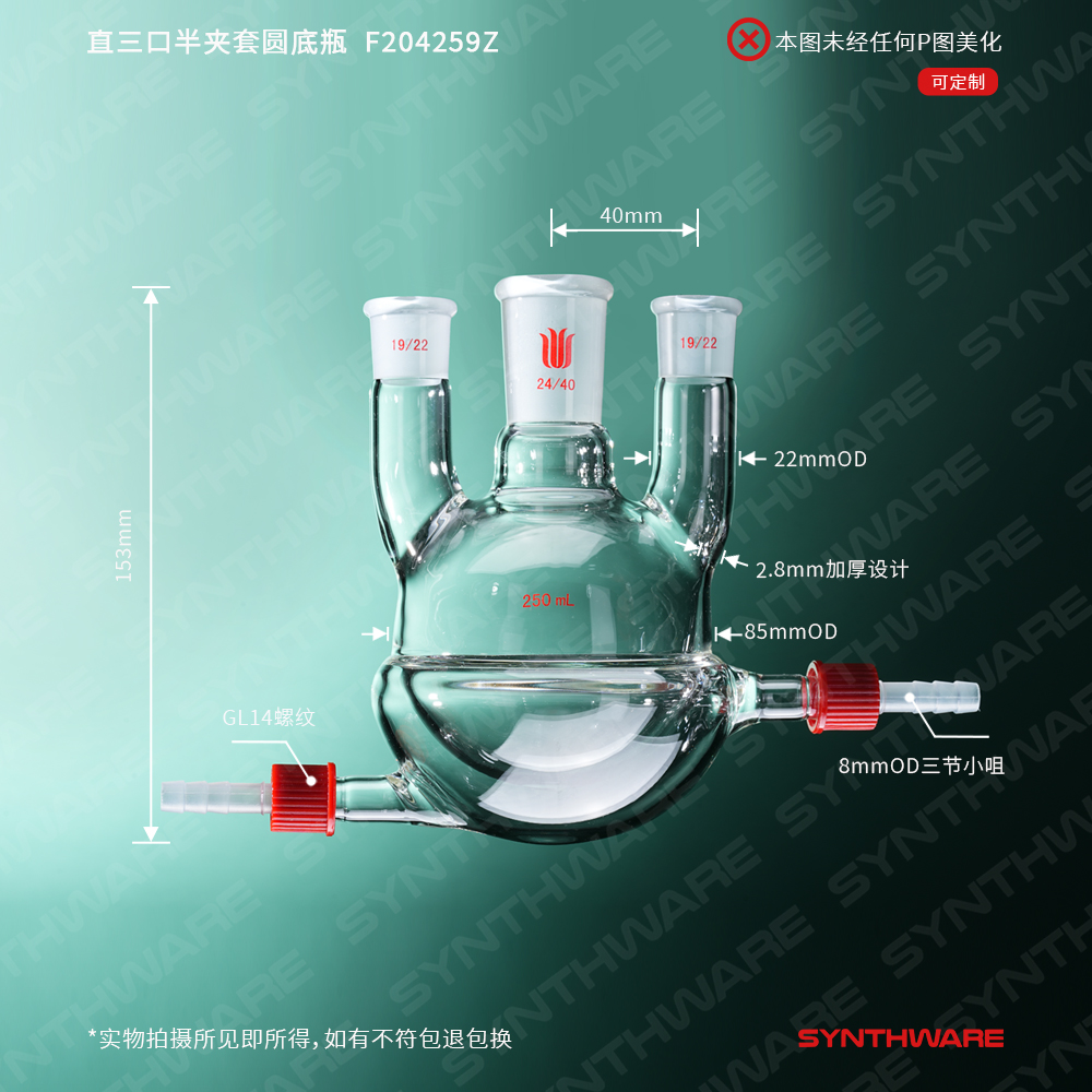 直三口半夹套圆底瓶,容量:250ml,主口:24/40,侧口:19/22 F204259Z