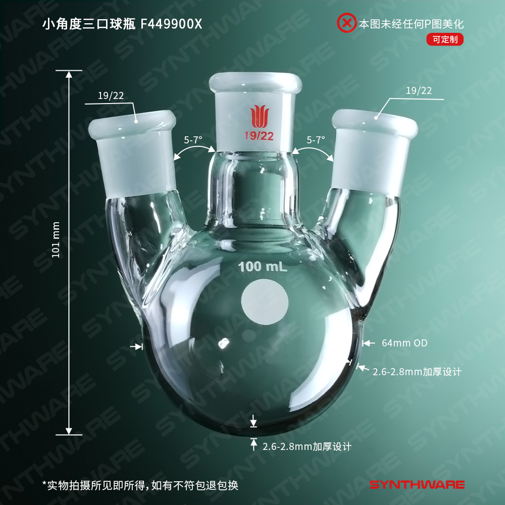 小角度三口球瓶,厚壁高强度,中间磨口:19/22,侧磨口:19/22,100ml F449900X