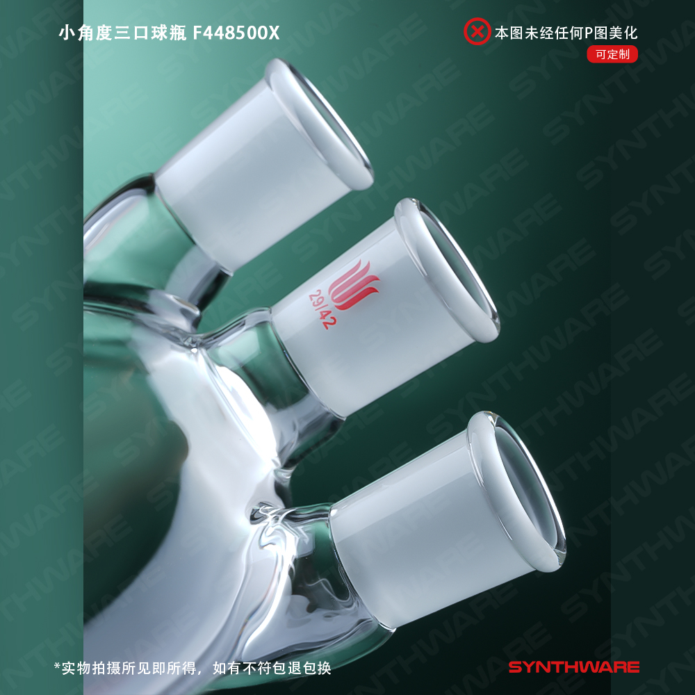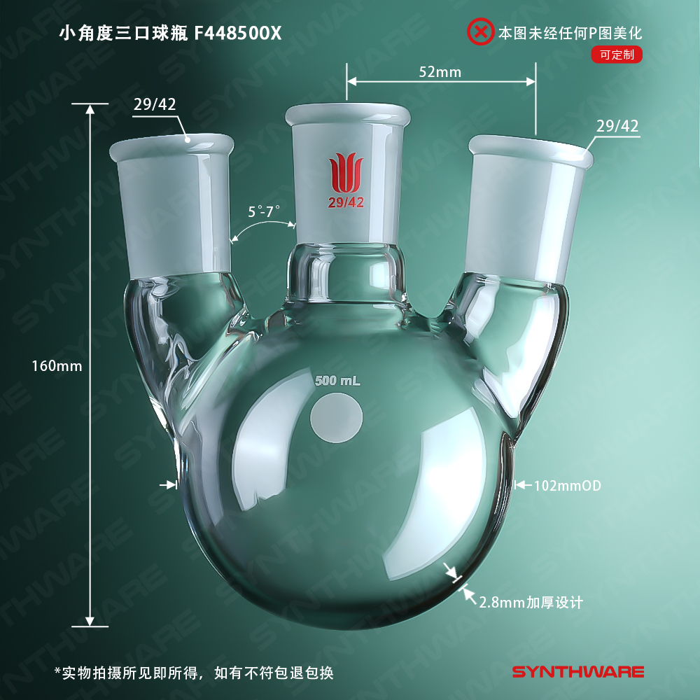 小角度三口球瓶,厚壁高强度,中间磨口:29/42,侧磨口:29/42,500ml F448500X