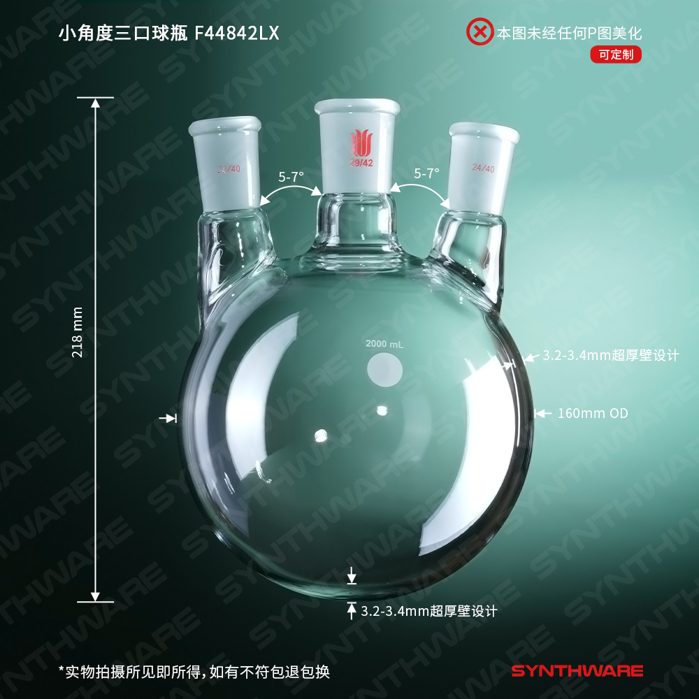 小角度三口球瓶,厚壁高强度,中间磨口:29/42,侧磨口:24/40,2000ml F44842LX