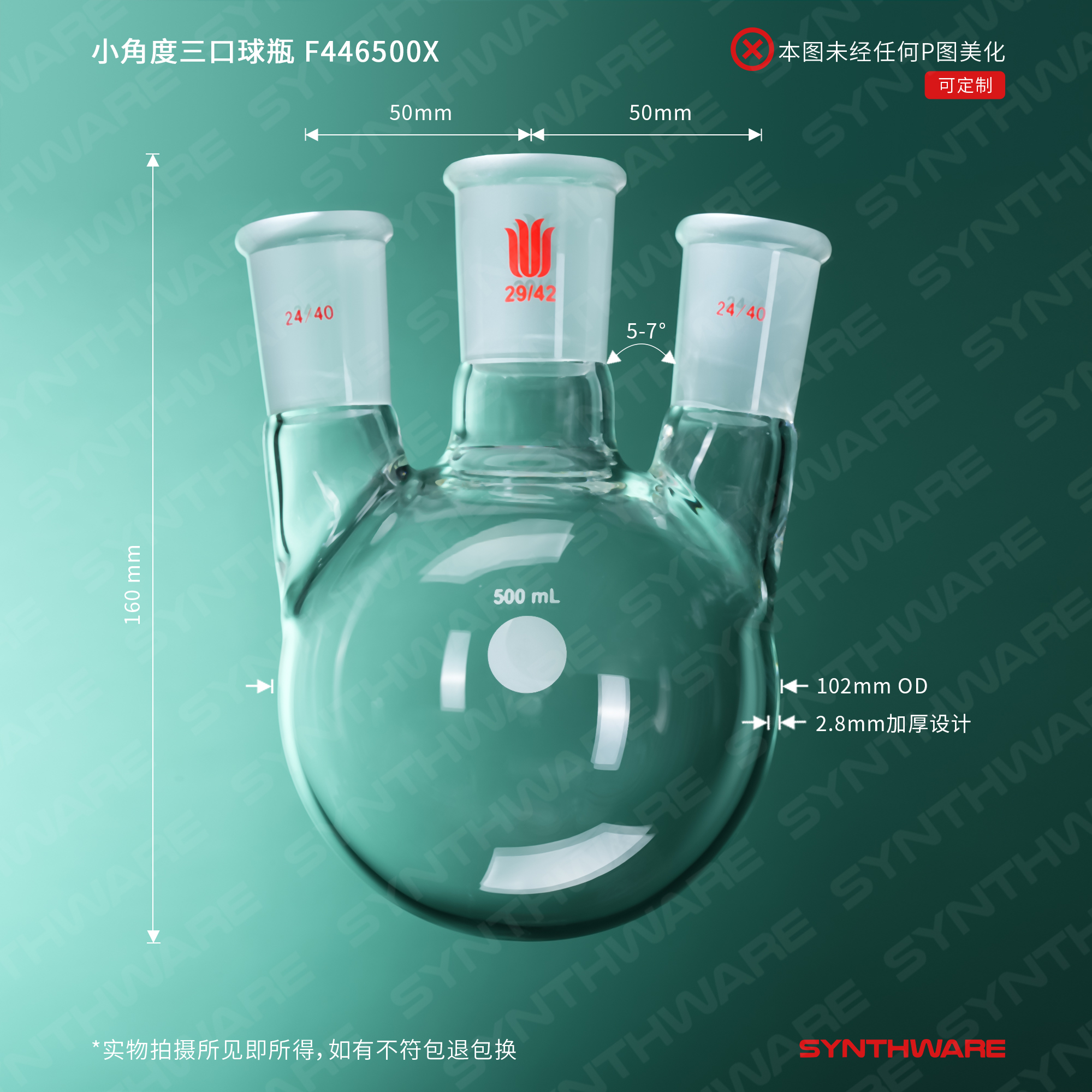 小角度三口球瓶,厚壁高强度,中间磨口:29/42,侧磨口:24/40,500ml F446500X