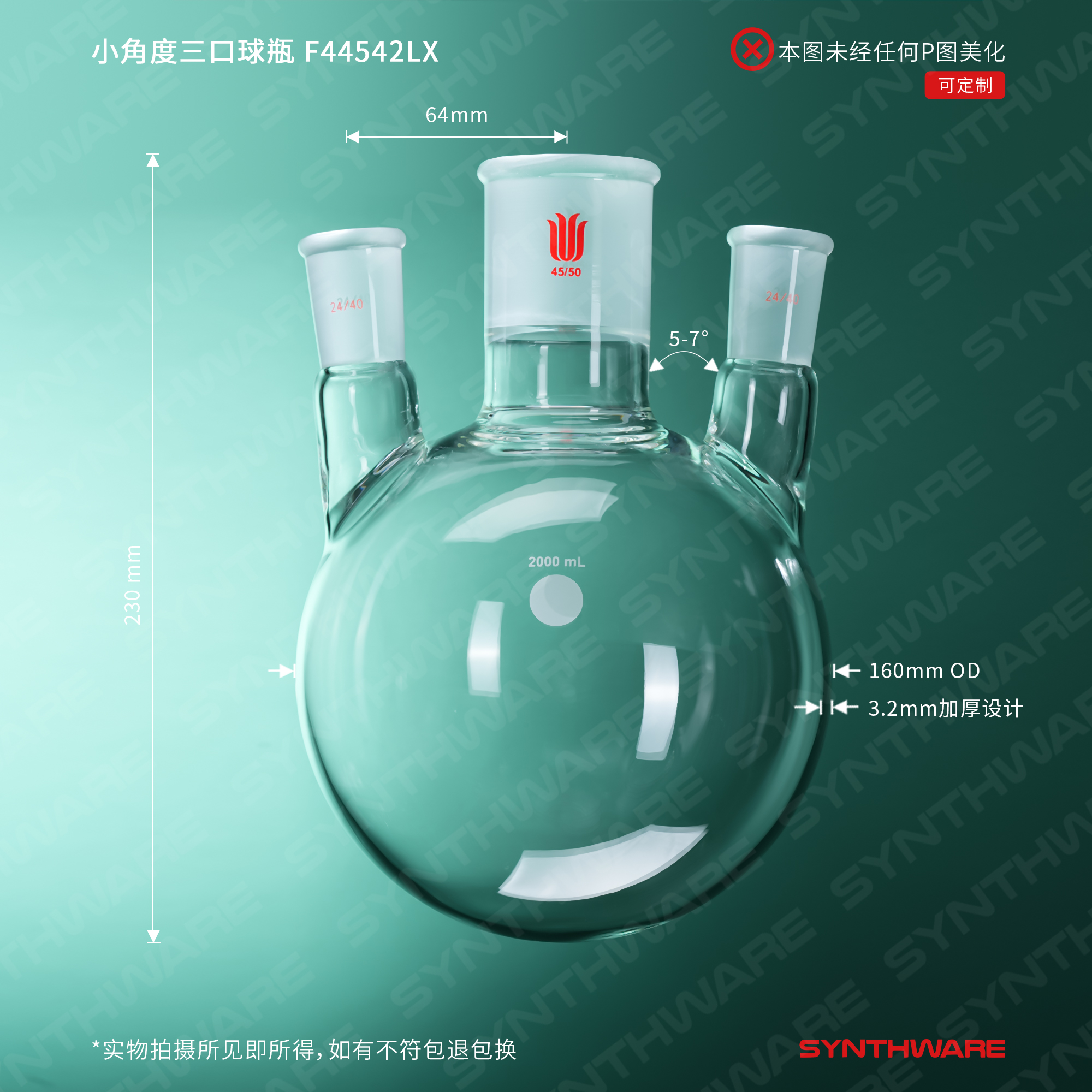 小角度三口球瓶,厚壁高强度,中间磨口:45/50,侧磨口:24/40,2000ml F44542LX