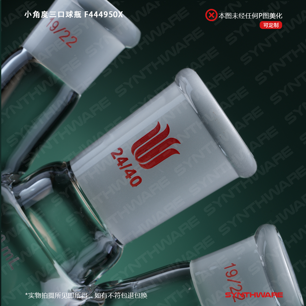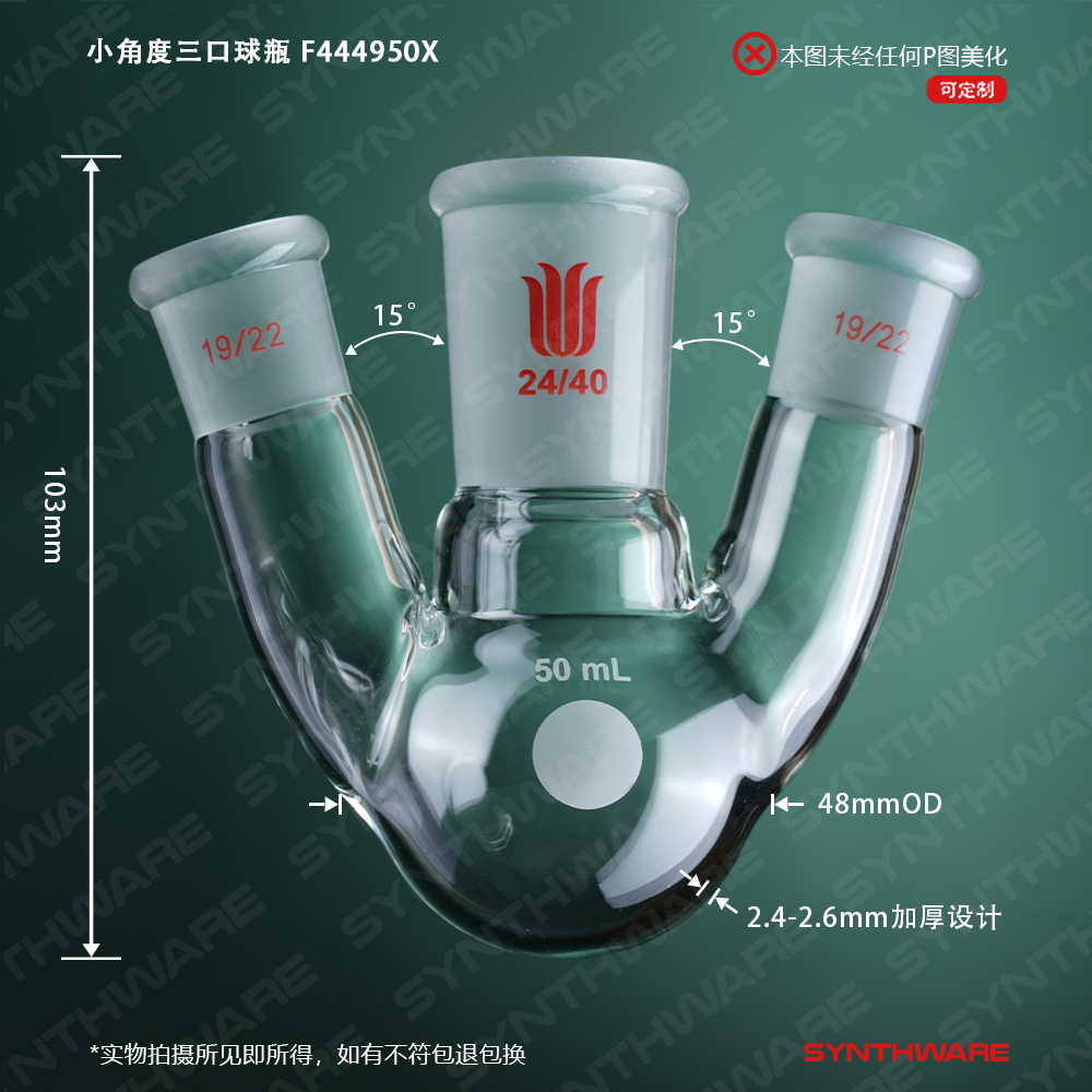 小角度三口球瓶,厚壁高强度,中间磨口:24/40,侧磨口:19/22,50ml F444950X