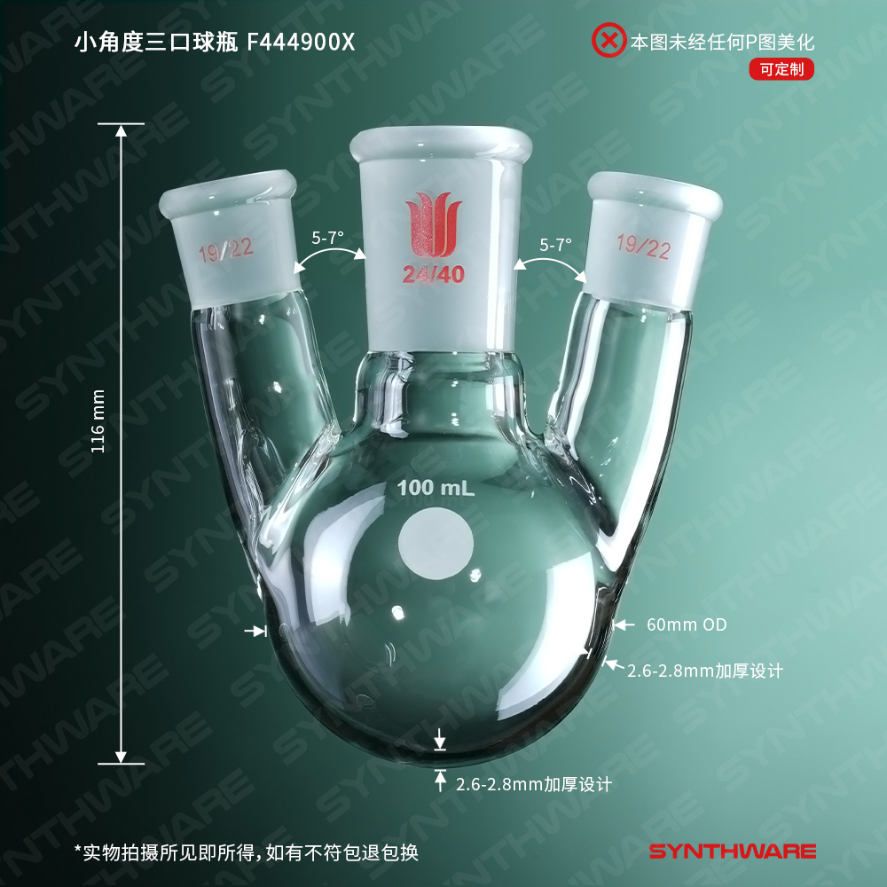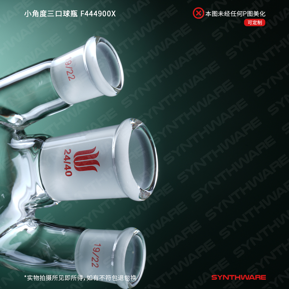小角度三口球瓶,厚壁高强度,中间磨口:24/40,侧磨口:19/22,100ml F444900X