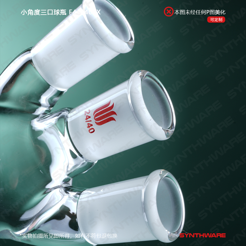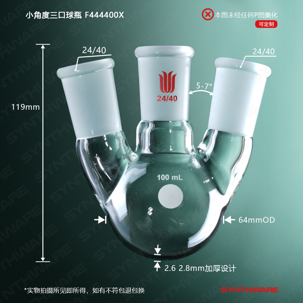 小角度三口球瓶,厚壁高强度,中间磨口:24/40,侧磨口:24/40,100ml F444400X