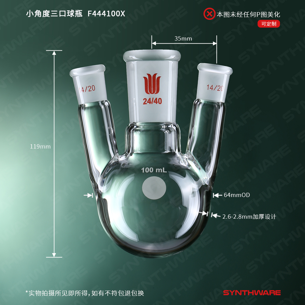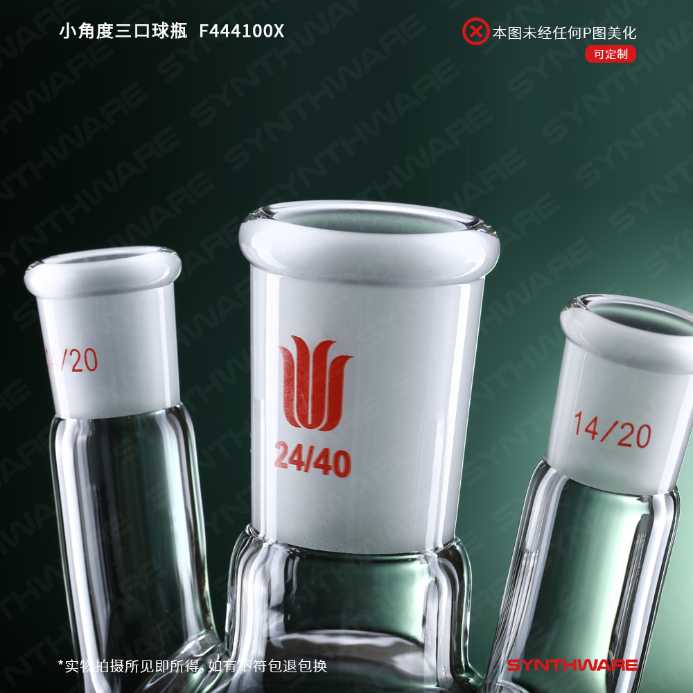 小角度三口球瓶,厚壁高强度,中间磨口:24/40,侧磨口:14/20,100ml F444100X