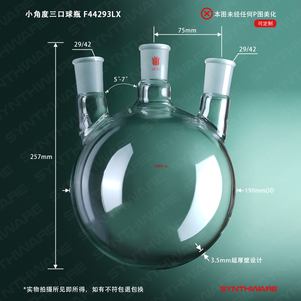 小角度三口球瓶,厚壁高强度,中间磨口:29/42,侧磨口:29/42,3000ml F44293LX