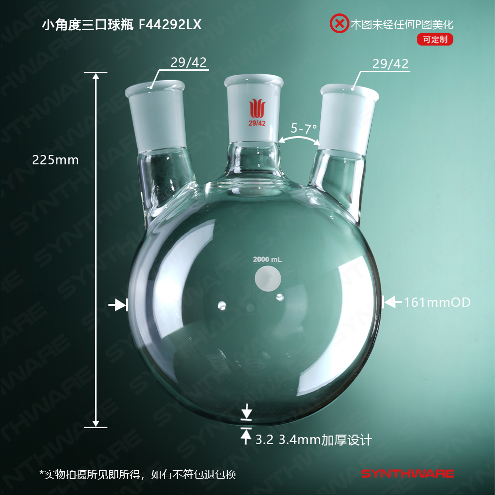 小角度三口球瓶,厚壁高强度,中间磨口:29/42,侧磨口:29/42,2000ml F44292LX