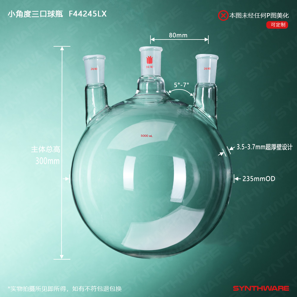 小角度三口球瓶,厚壁高强度,中间磨口:24/40,侧磨口:24/40,5000ml F44245LX