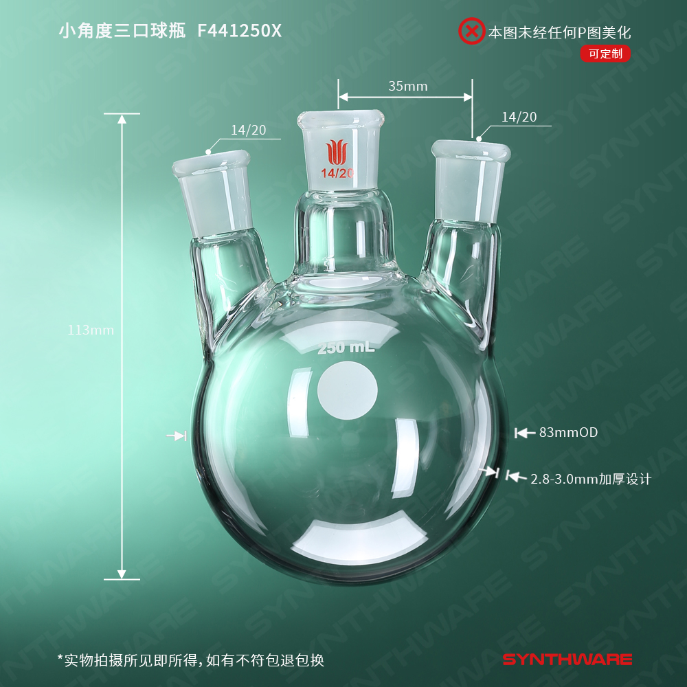 小角度三口球瓶,厚壁高强度,中间磨口:14/20,侧磨口:14/20,250ml F441250X
