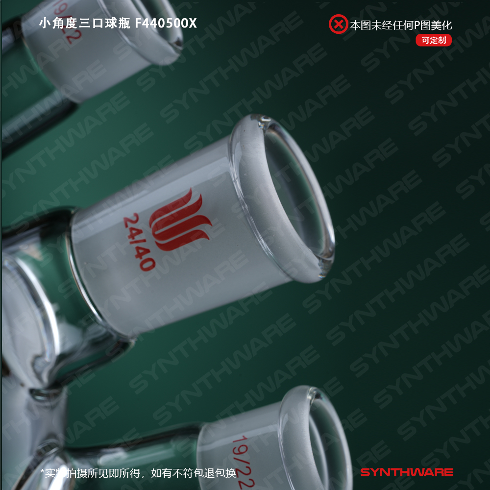 侧口可与温度计接头搭配插入温度计或导气管,检测体系温度或连通气源。也可根据需求连接其他功能性接头或装置如:通气接头,冷凝器,加料漏斗等。