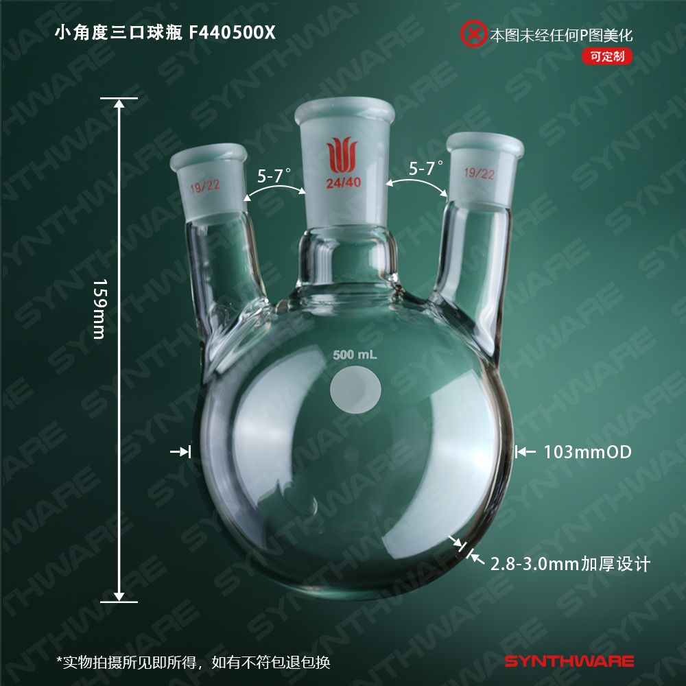 小角度三口球瓶,厚壁高强度,中间磨口24/40,侧磨口:19/22,500ml F440500X