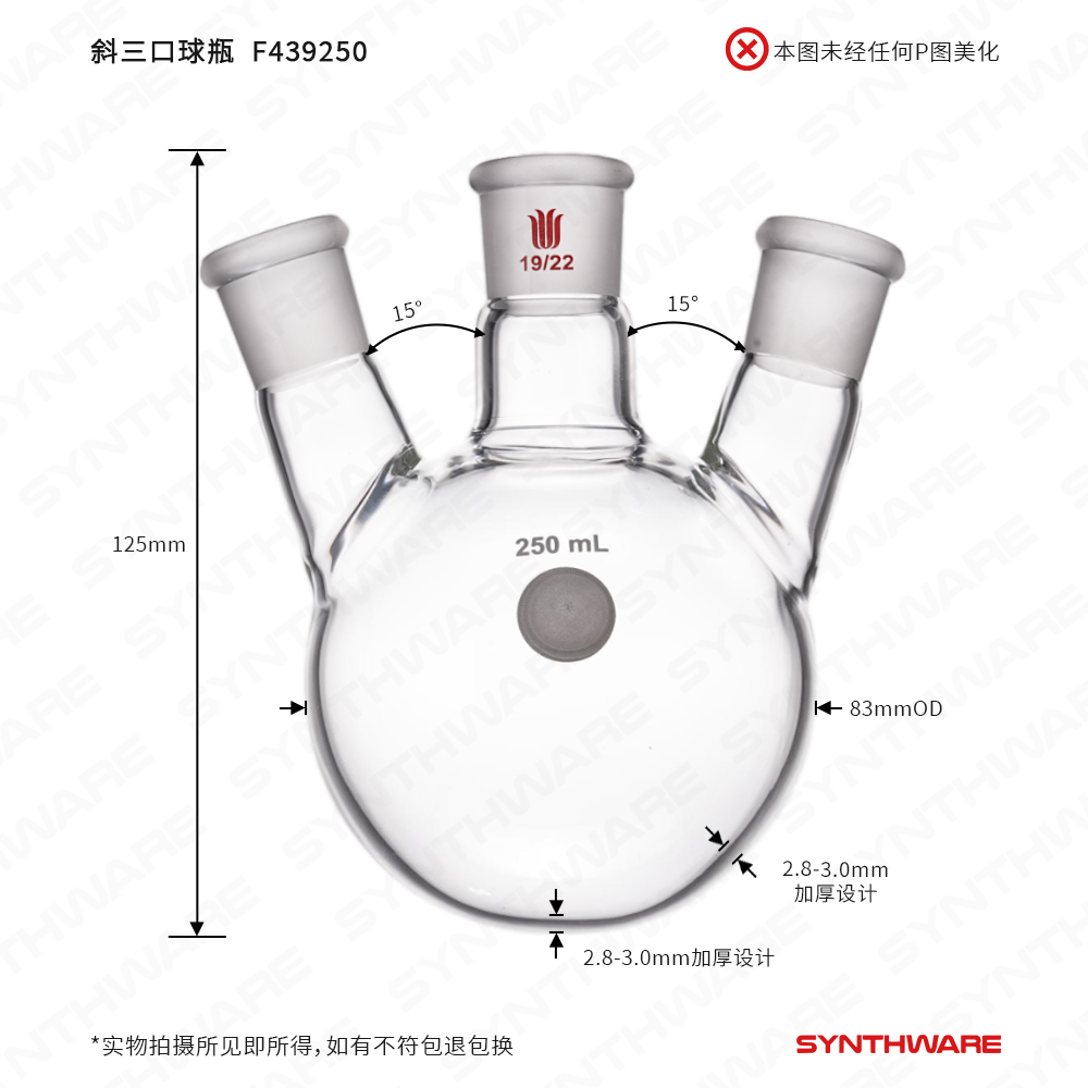 斜三口球瓶,厚壁高强度,中间磨口:19/22,侧磨口:19/22,250ml F439250