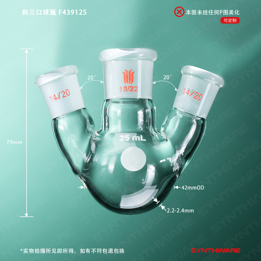 斜三口球瓶,厚壁高强度,中间磨口:19/22,侧磨口:14/20,25ml F439125