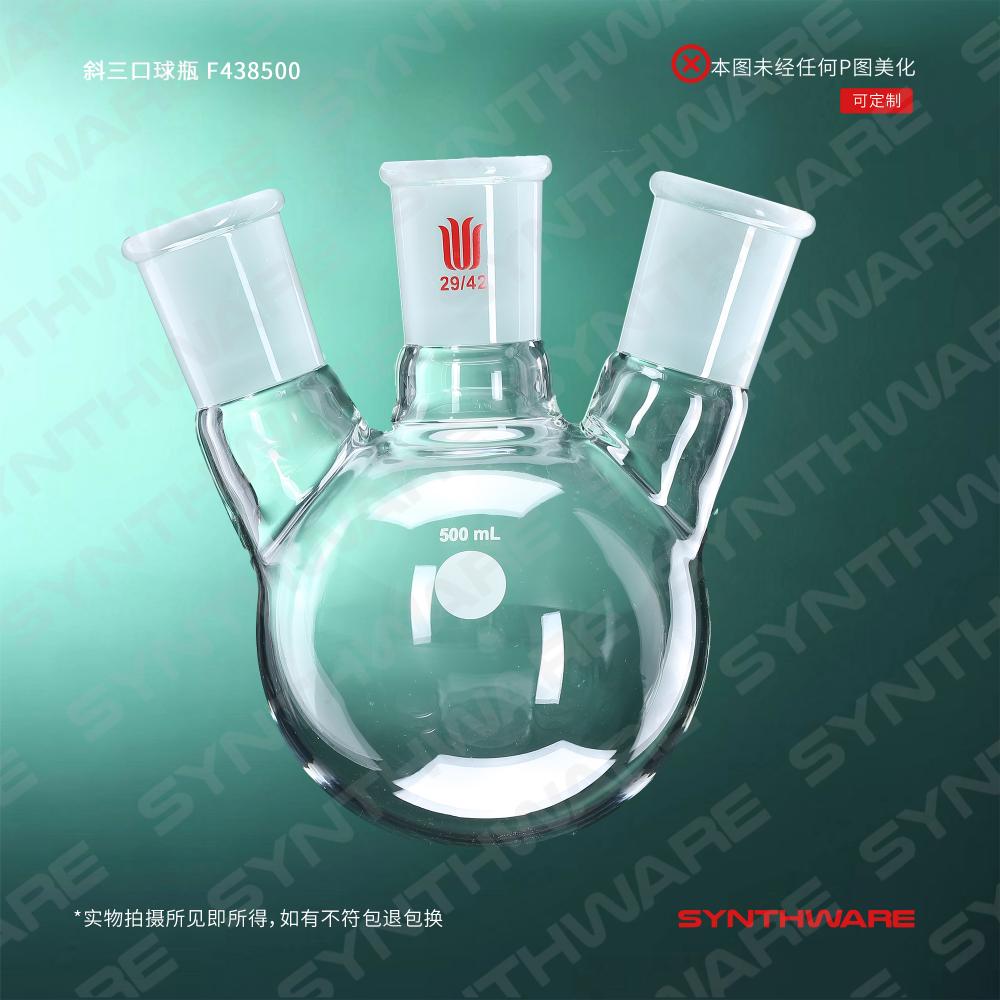 斜三口球瓶,厚壁高强度,中间磨口:29/42,侧磨口:29/42,500ml F438500