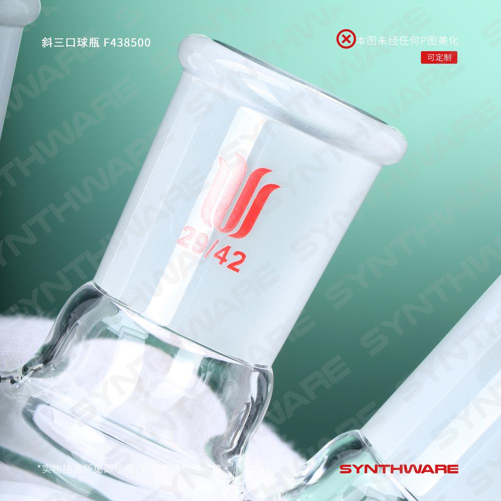 # 侧口可根据需求连接其他功能性接头或装置如:通气接头,冷凝器,加料漏斗等。不建议连接温度计或温度计套管类产品,如果需要连接温度计类产品请选购F44X小角度两口瓶系列。