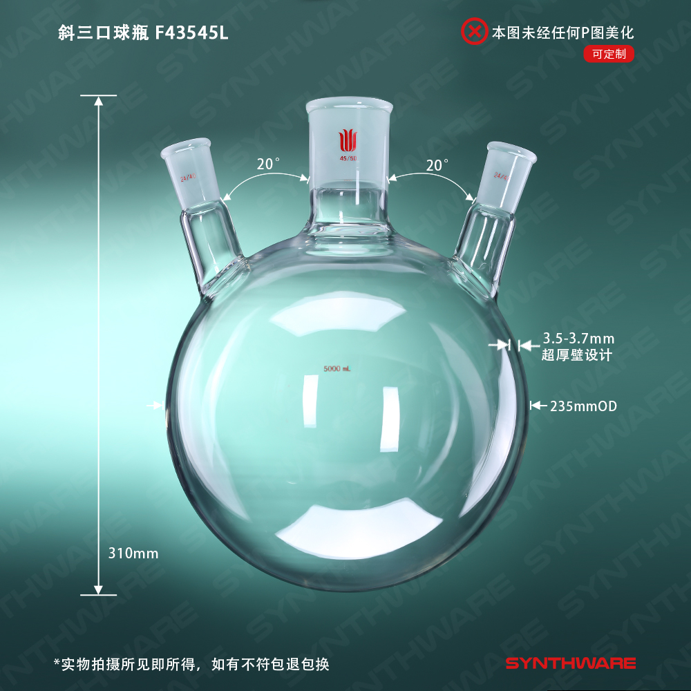 斜三口球瓶,厚壁高强度,中间磨口:45/50,侧磨口:24/40,5000ml F43545L