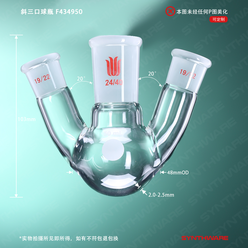 斜三口球瓶,厚壁高强度,中间磨口:24/40,侧磨口:19/22,50ml F434950