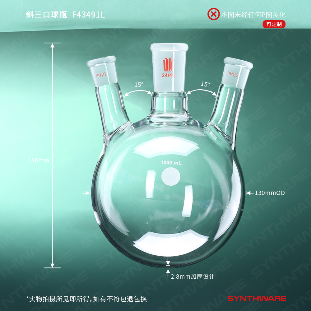斜三口球瓶,厚壁高强度,中间磨口:24/40,侧磨口:19/22,1000ml F43491L