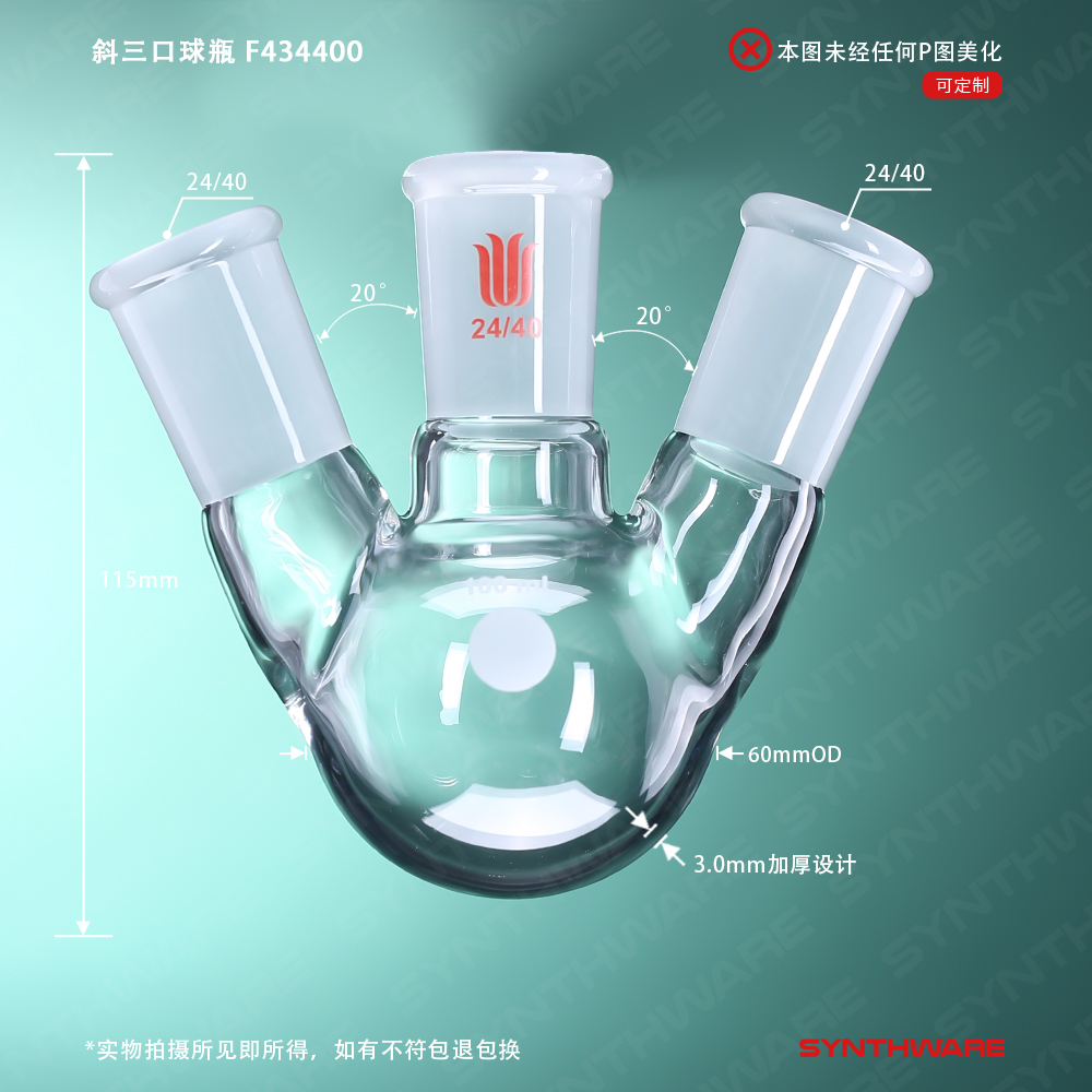 斜三口球瓶,厚壁高强度,中间磨口:24/40,侧磨口:24/40,100ml F434400