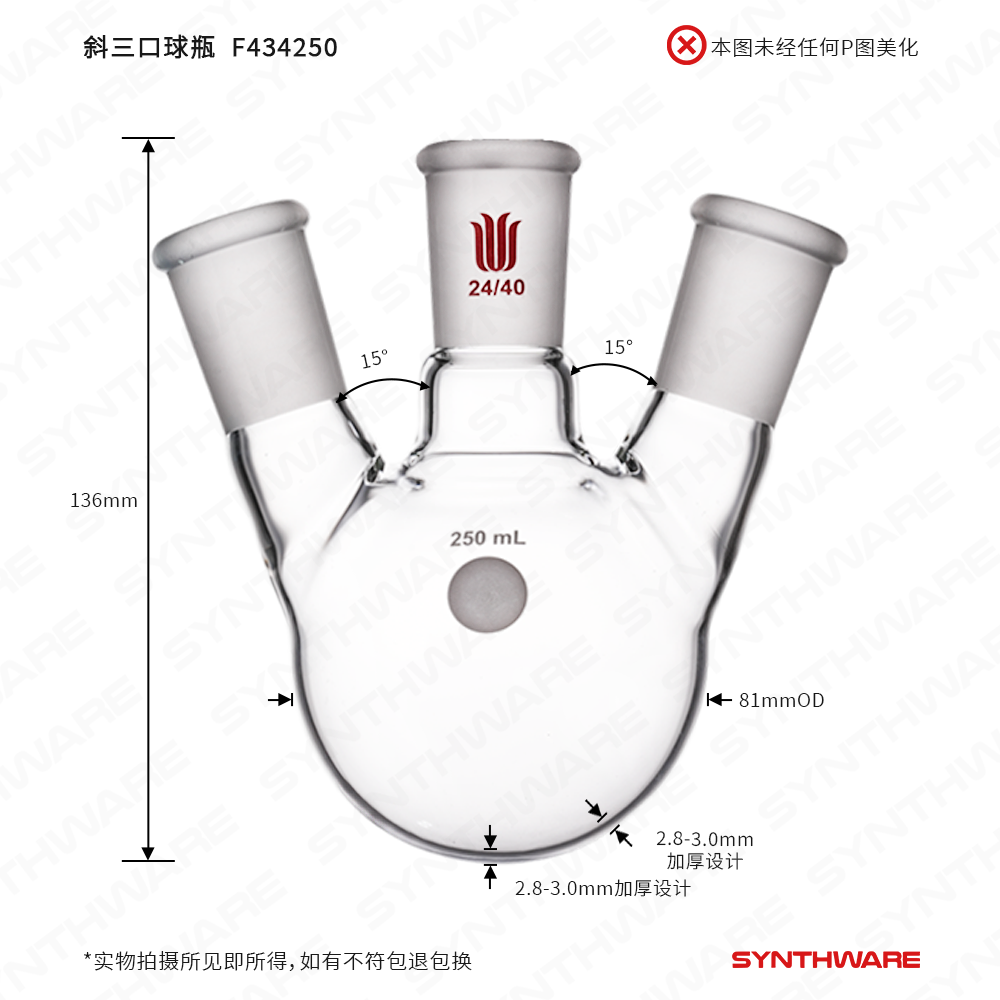 斜三口球瓶,厚壁高强度,中间磨口:24/40,侧磨口:24/40,250ml F434250