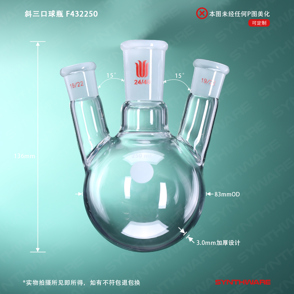 斜三口球瓶,厚壁高强度,中间磨口:24/40,侧磨口:19/22,250ml F432250