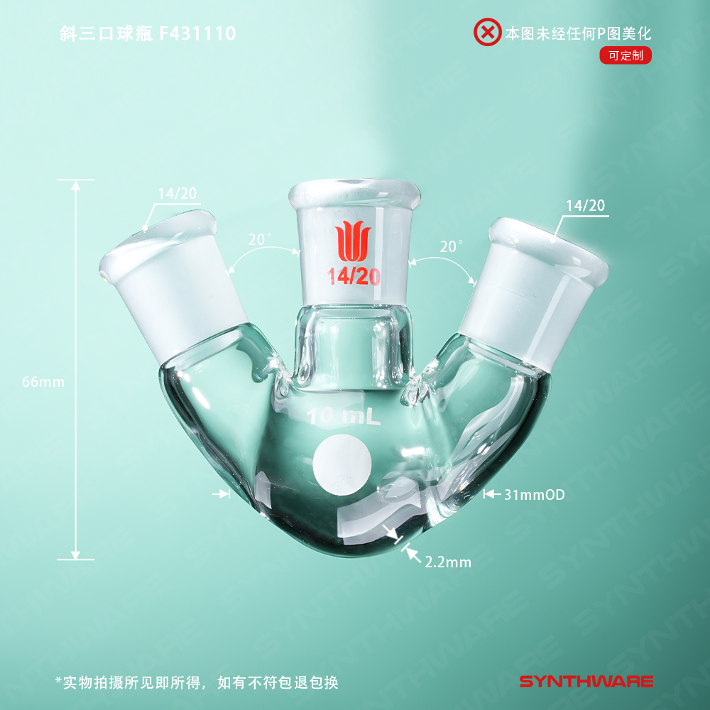 斜三口球瓶,厚壁高强度,中间磨口:14/20,侧磨口:14/20,10ml F431110