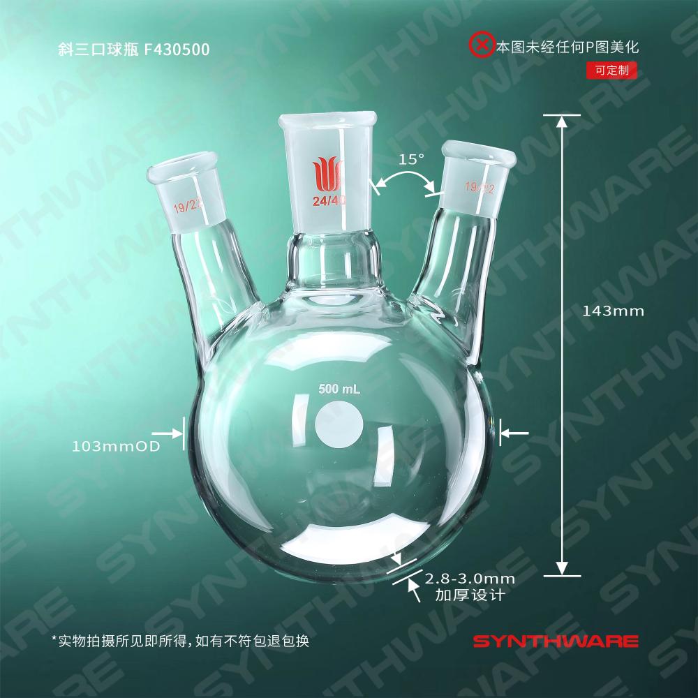 斜三口球瓶,厚壁高强度,中间磨口:24/40,侧磨口:19/22,500ml F430500
