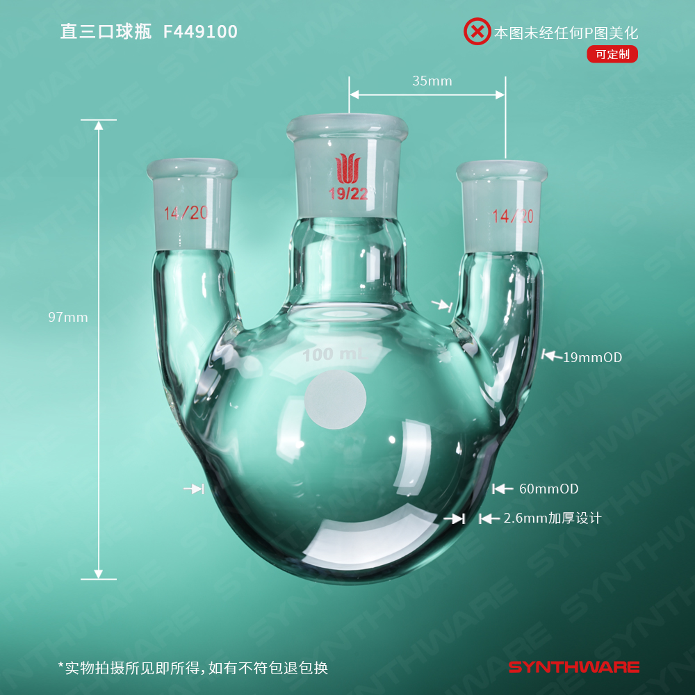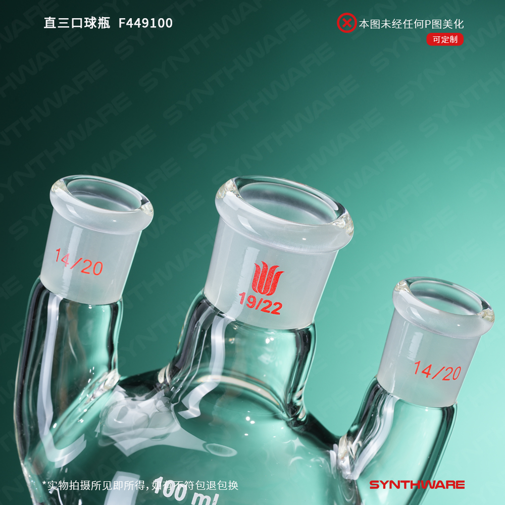 直三口球瓶,厚壁高强度,中间磨口:19/22,侧磨口:14/20,100ml F449100
