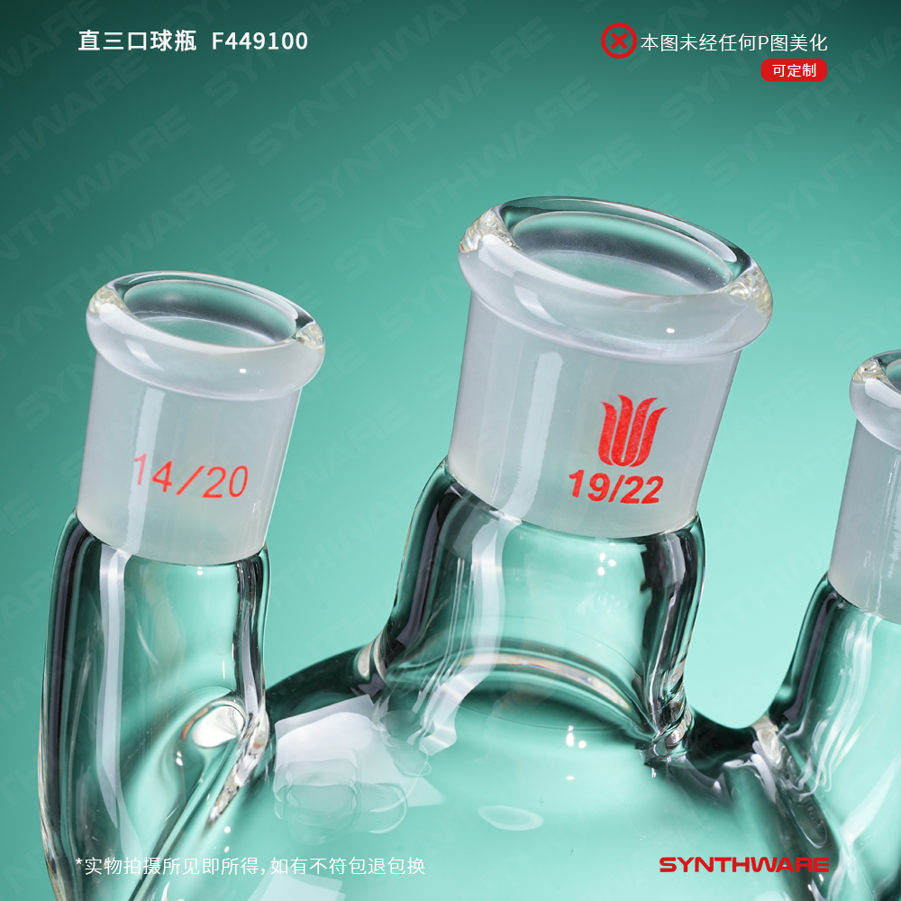 # 侧口可根据需求连接其他功能性接头或装置如:通气接头,冷凝器,加料漏斗等。不建议连接温度计或温度计套管产品,如果需要连接温度计,请选购F44X小角度三口瓶产品。