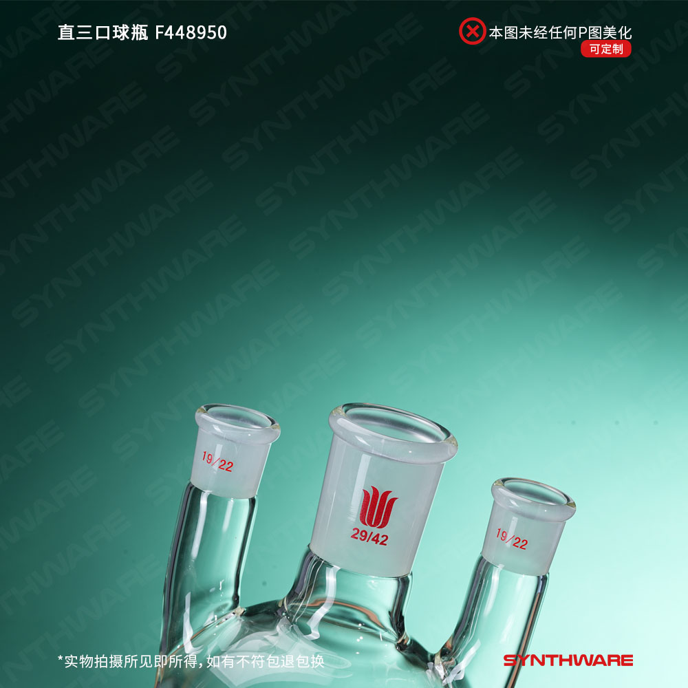 # 侧口可根据需求连接其他功能性接头或装置如:通气接头,冷凝器,加料漏斗等。不建议连接温度计或温度计套管产品,如果需要连接温度计,请选购F44X小角度三口瓶产品。