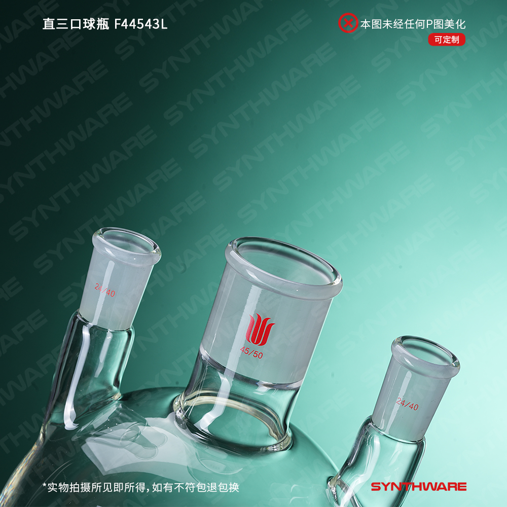 # 侧口可根据需求连接其他功能性接头或装置如:通气接头,冷凝器,加料漏斗等。不建议连接温度计或温度计套管产品,如果需要连接温度计,请选购F44X小角度三口瓶产品。