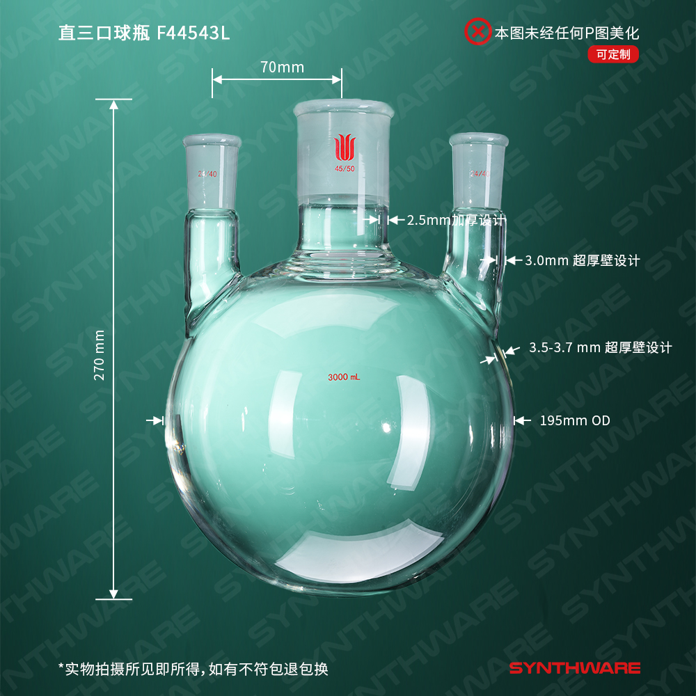 直三口球瓶,厚壁高强度,中间磨口:45/50,侧磨口:24/40,3000ml F44543L