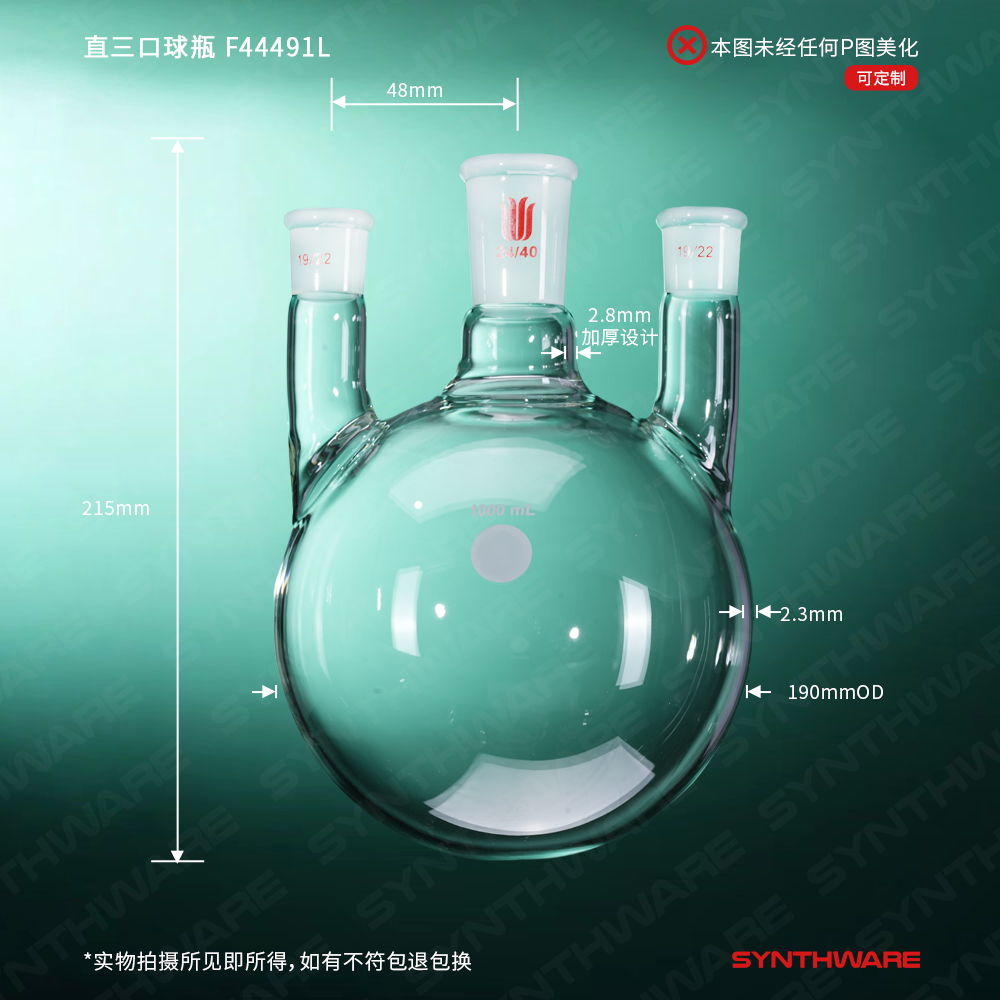 直三口球瓶,厚壁高强度,中间磨口:24/40,侧磨口:19/22,1000ml F44491L