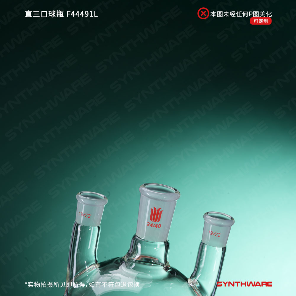 # 侧口可根据需求连接其他功能性接头或装置如:通气接头,冷凝器,加料漏斗等。不建议连接温度计或温度计套管产品,如果需要连接温度计,请选购F44X小角度三口瓶产品。