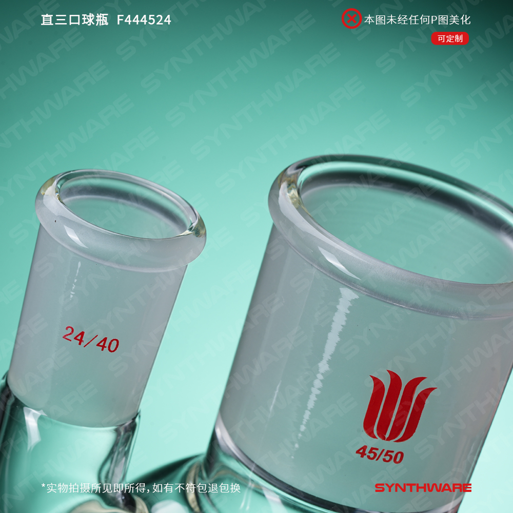 # 侧口可根据需求连接其他功能性接头或装置如:通气接头,冷凝器,加料漏斗等。不建议连接温度计或温度计套管产品,如果需要连接温度计,请选购F44X小角度三口瓶产品。