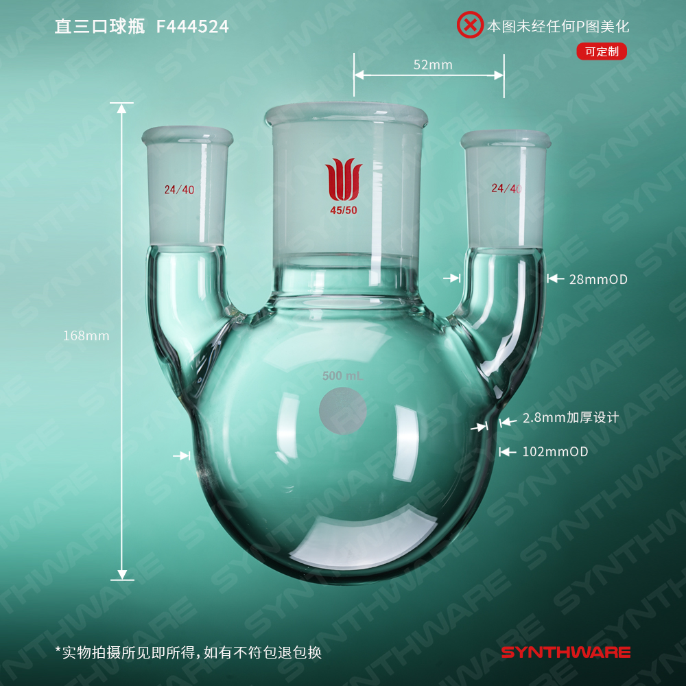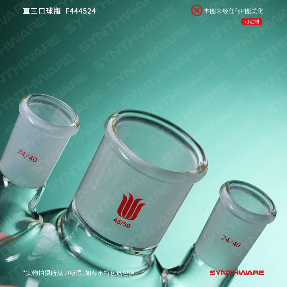 直三口球瓶,厚壁高强度,中间磨口:45/50,侧磨口:24/40,500ml F444524