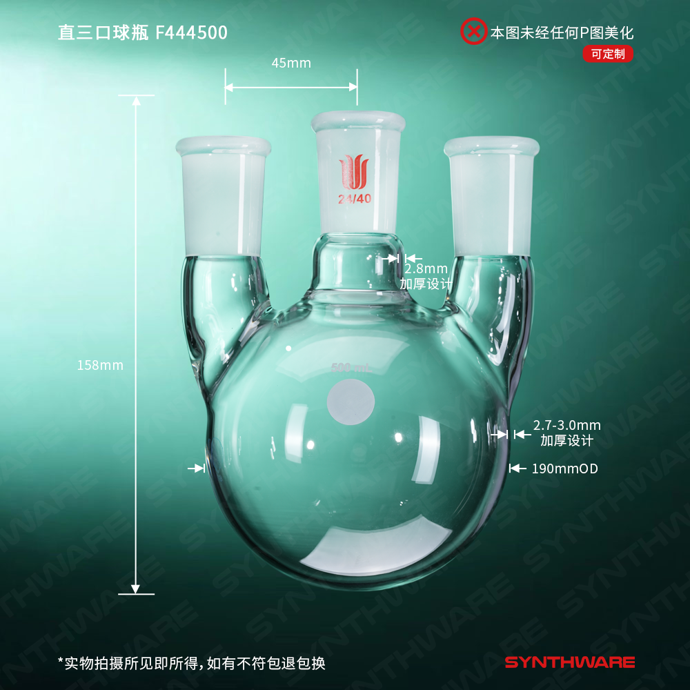 直三口球瓶,厚壁高强度,中间磨口:24/40,侧磨口:24/40,500ml F444500