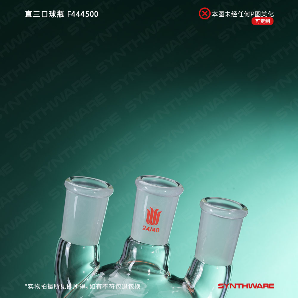 # 侧口可根据需求连接其他功能性接头或装置如:通气接头,冷凝器,加料漏斗等。不建议连接温度计或温度计套管产品,如果需要连接温度计,请选购F44X小角度三口瓶产品。