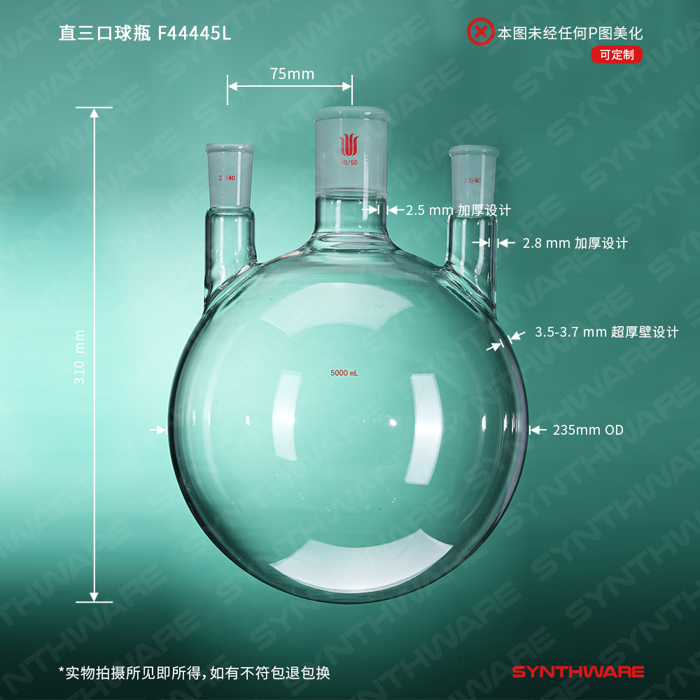 直三口球瓶,厚壁高强度,中间磨口:40/50,侧磨口:24/40,5000ml F44445L